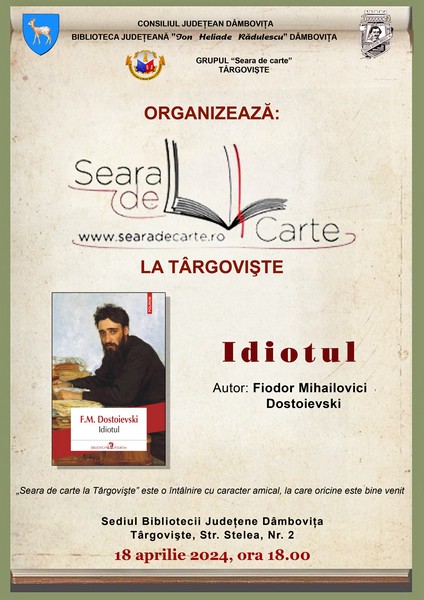 Joi, 18 aprilie 2024, ora 18.00, are loc o nouă întâlnire „Seara de carte la Târgovişte”, la sediul Bibliotecii Judeţene „I. H. Rădulescu” Dâmboviţa (Str. Stelea, Nr. 2).